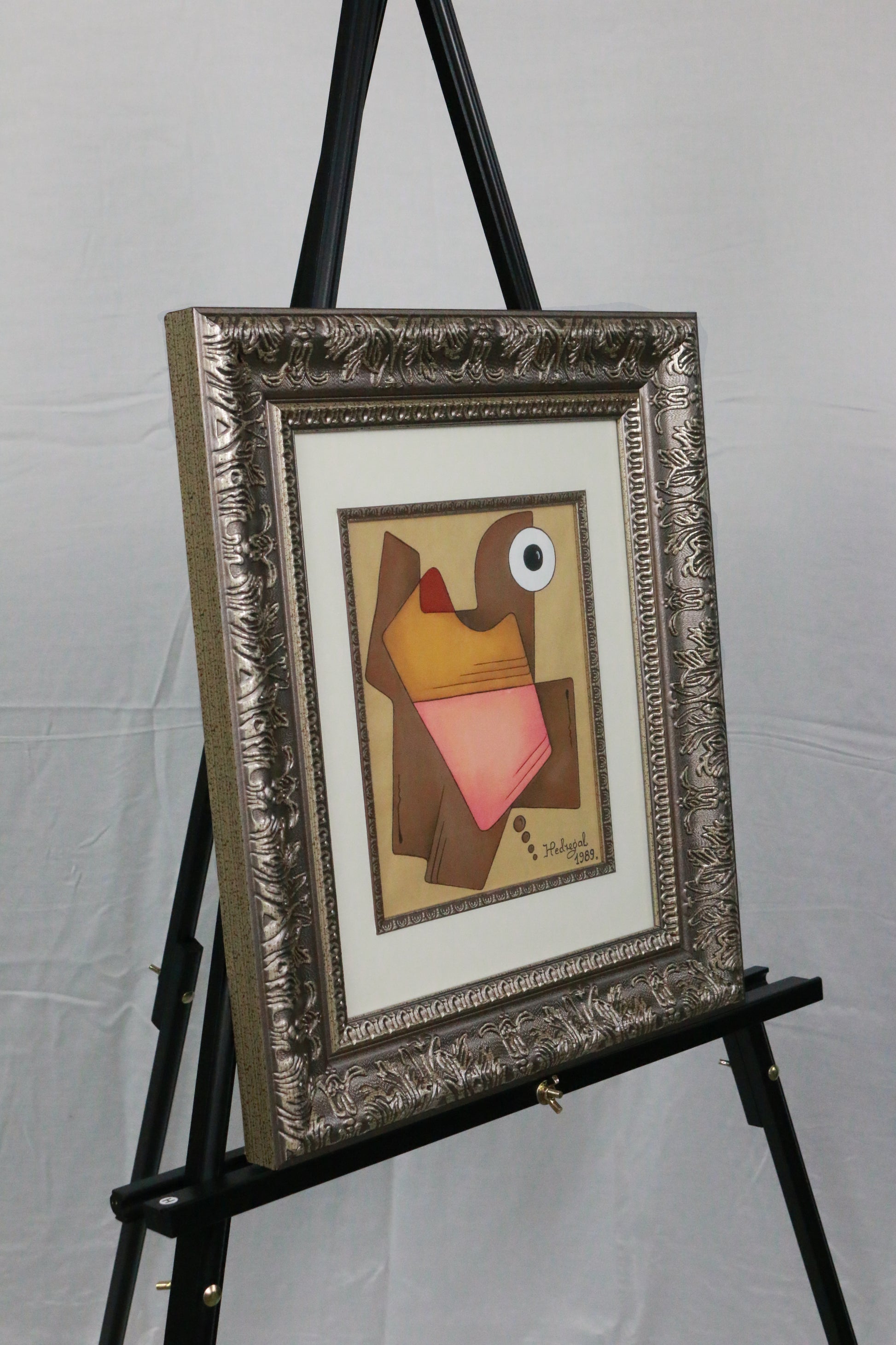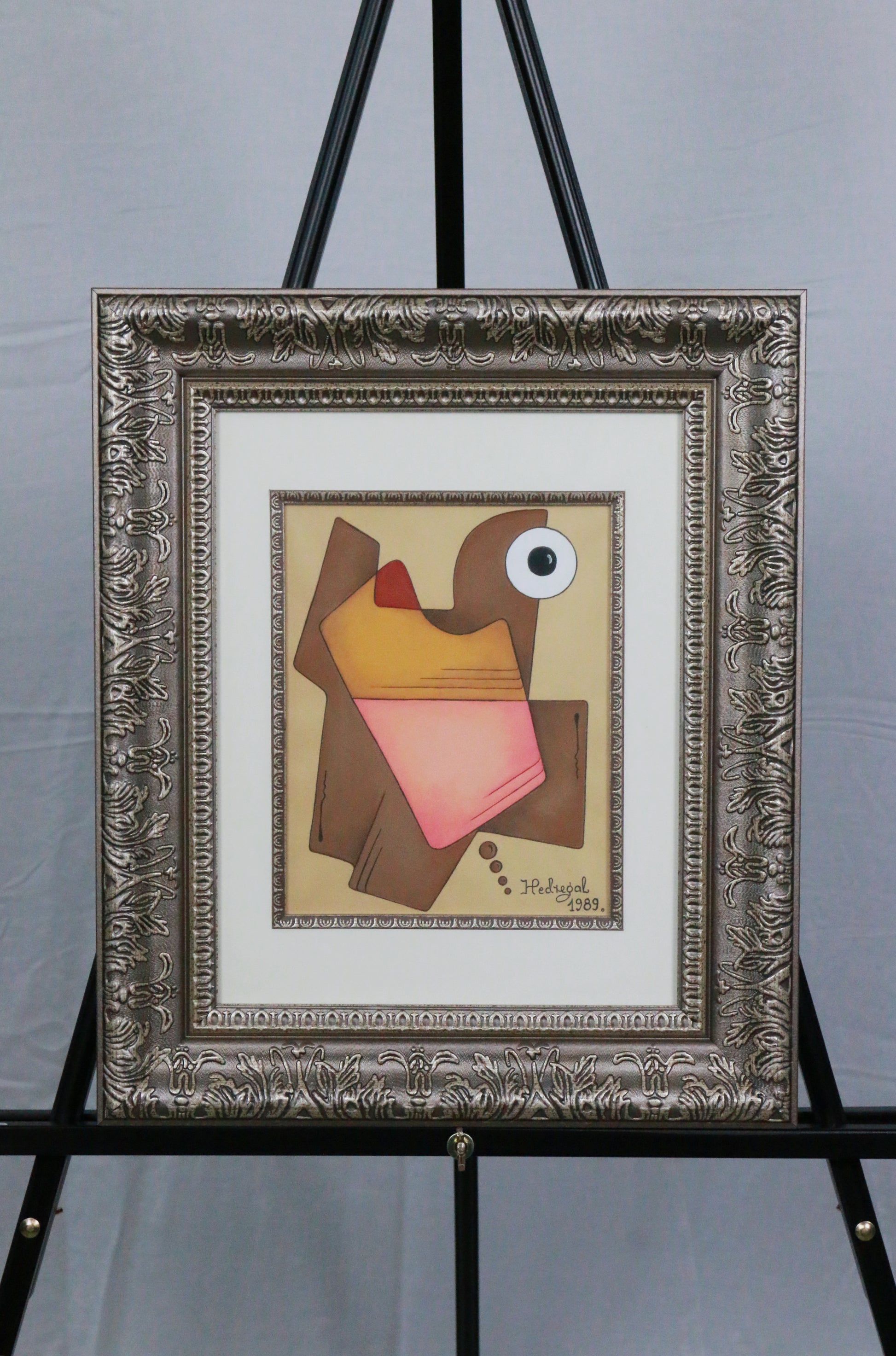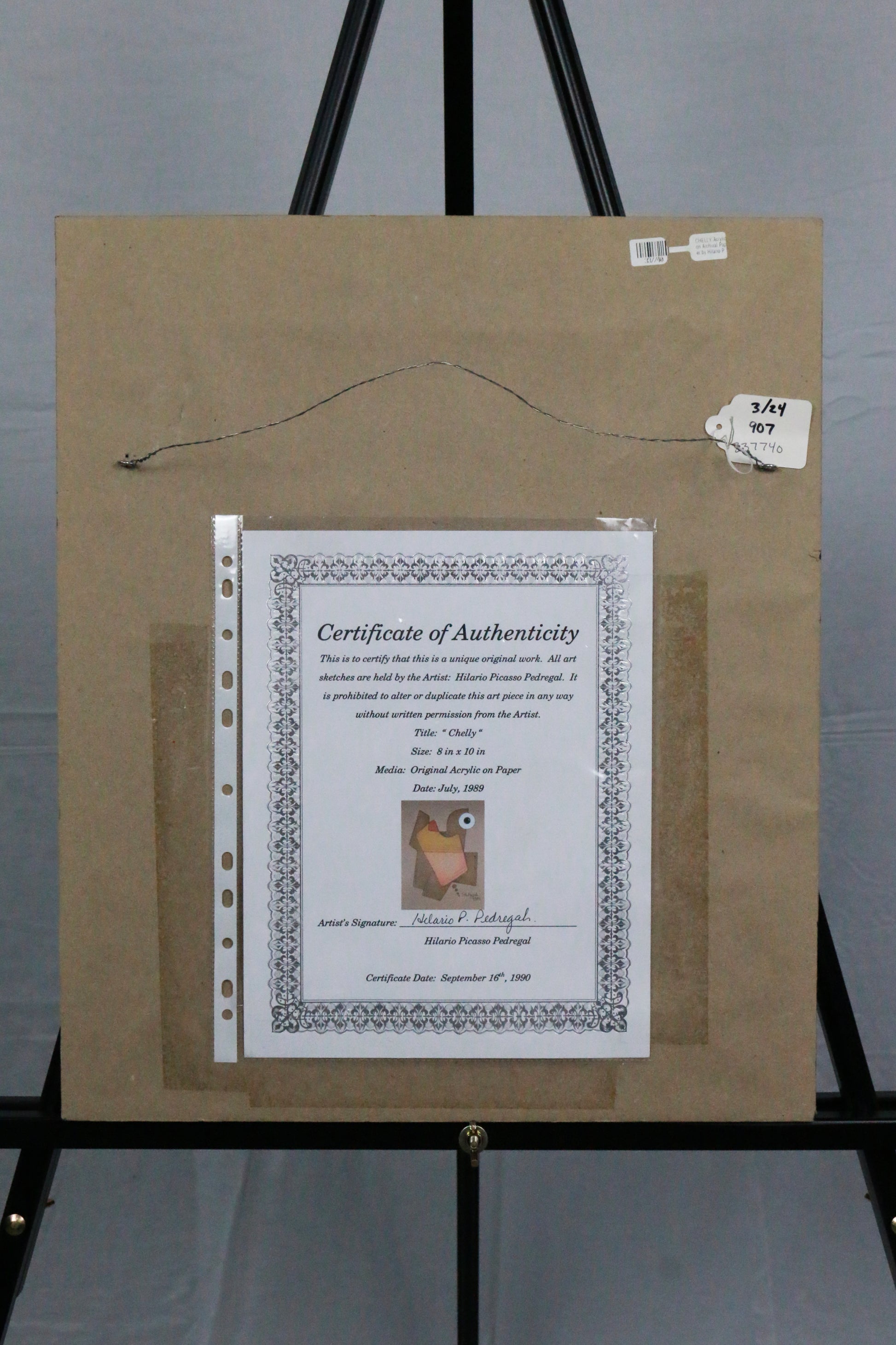 DESCRIPTION: This acrylic on archival paper composition is titled "Chelly" and is by universally acclaimed artist Hilario "Picasso" Pedregal. This piece features an abstract composition depicting the features of a face. Hilario carefully layers his acrylic paints so that the saturated color is not marred with brushstrokes. This is done to mimic the luminosity of oil paint. Pedregal is known for his precise color combinations and smooth paint application. His use of bright and lively colors reflect his life in the tropics. This piece is signed by the artist and dated for 1989. The paper measures 10"h x 8"w and the framed dimensions are 16"h x 19"w. This piece includes a certificate of authenticity.